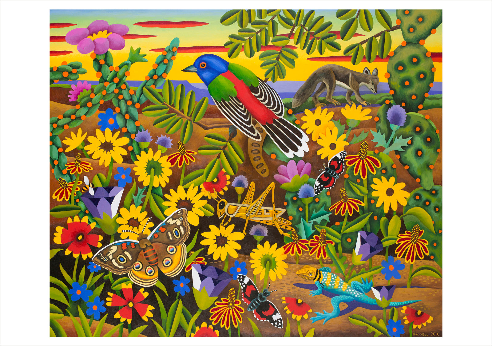 New York Times refers to Billy Hassell, whose vivid paintings are studies in stylized naturalism, rooted in a deep sense of place. An artist and conservationist since childhood, Hassell (American, b. 1956) roamed the creeks and uncultivated areas around Dallas and began his life’s work by observing and drawing the lizards and other creatures he carried home in his pockets. He was as fascinated by their patterns and colors as he was by their very existence. Like the natural world itself, his paintings are charged with color and life, their energy balanced by points of stillness. He invites viewers to be quiet for a moment and venture into the wild. This inquisitive artist’s work is influenced by his travels, and though he still calls Texas home, he enjoys getting to know the land and its denizens wherever he goes. Throughout his career, Hassell has created limited-edition lithograph series whose sales support conservation-related organizations such as Audubon Texas, Texas Parks and Wildlife, and the Big Bend Conservancy.