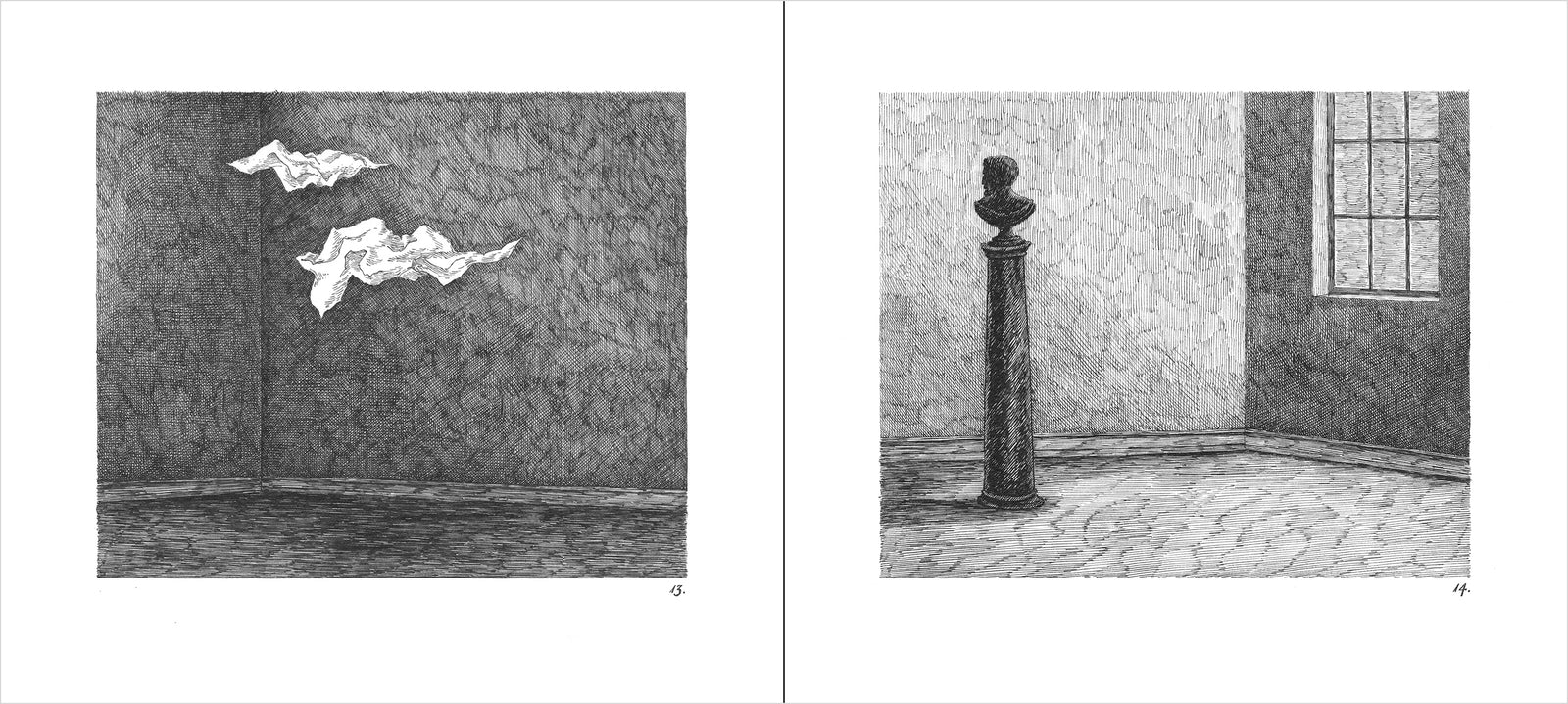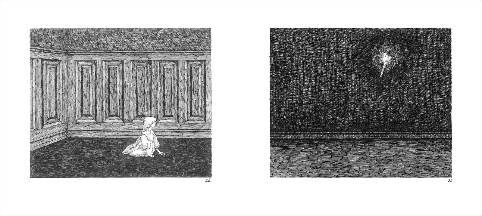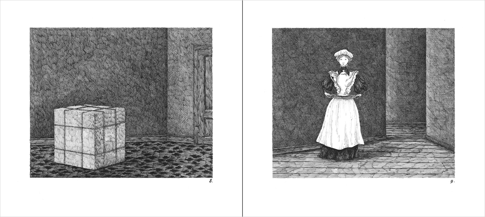 Originally published in 1963, The West Wing is one of Edward Gorey’s classic books. This wordless tale unfolds through 31 mysterious drawings that carry the viewer from room to room via long corridors. Peeling wallpaper hangs to the floor, a candle held by invisible hands casts light into the dark, and odd characters appear unbidden. The viewer wonders: What’s haunting this building? And who left that boulder on the table? First released as part of The Vinegar Works: Three Volumes of Moral Instruction (which included The Gashlycrumb Tinies and The Insect God) this book is undoubtedly a cautionary tale. Stop. Do not enter. Unless you dare to find out what’s happening in The West Wing.