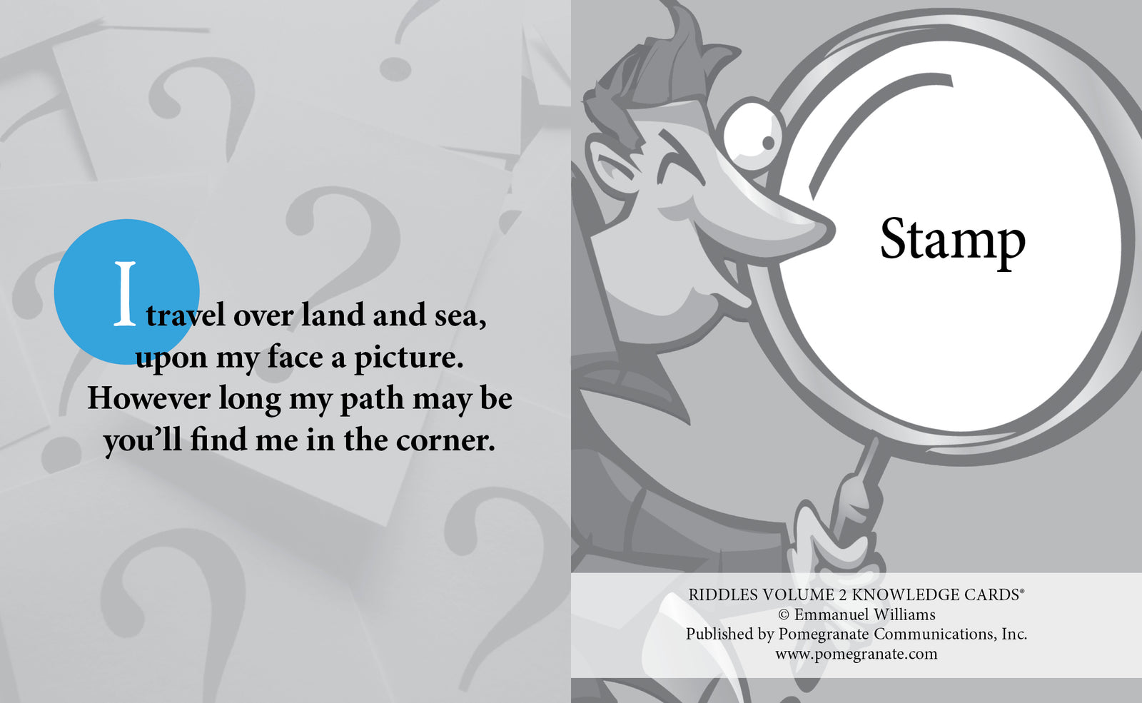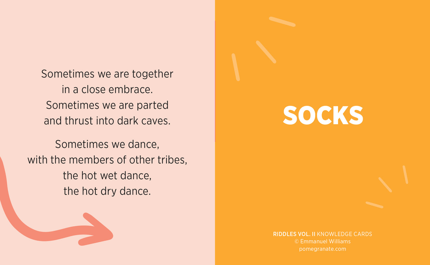 Riddles are the oldest language game in the world. The 48 brain benders collected here will beguile all ages, feeding young minds and keeping old brains sharp and active. This follow-up deck to poet and educator Emmanuel Williams’s best-selling Vol. I is a perfect solo amusement or group activity: on the front of each card, a wily description hints to a common object’s identity; on the back, a forehead-smacking reveal awaits. Stump your friends and family—and yourself!—and have some laughs while discovering how clever you really are.