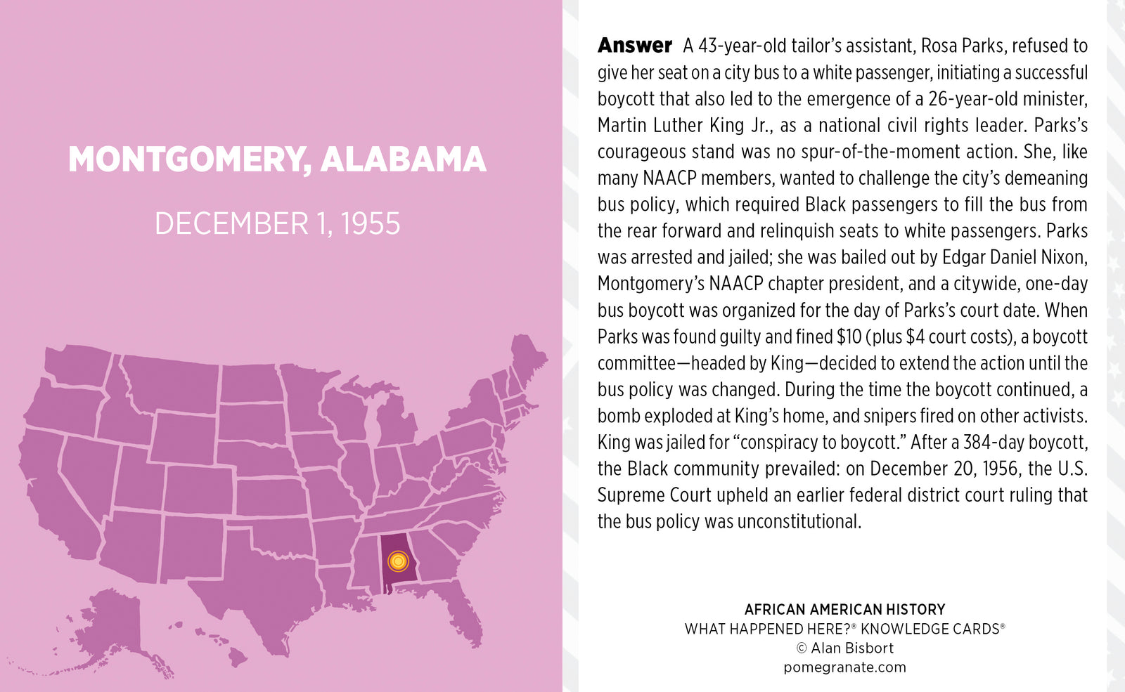 Oxford, Selma, Montgomery, Birmingham, Little Rock: some place names are unforgettably associated with the events bitter and brave that happened there. This deck of 48 cards visits the sites of broad fame or infamy, and briefly recounts their significance in African American history. But the reader will also touch down in places like Atlantic City, New Jersey (where the redoubtable Fannie Lou Hamer made her presence known at the 1964 Democratic national convention), Nantucket, Massachusetts (the escaped slave Frederick Douglass attended his first antislavery gather there in 1841), and Auburn, New York (final home to Harriet Tubman, who died there in 1913). In other words, the author hasn't been satisfied to simply hit the high spots; instead, he has dug deep to come up with this satisfying minihistory. Each card gives a location, date, and year on one side, with an arrow pointing to the location on a map of the United States. The card's back tells what took place there. A stimulating classroom tool and an attractive, well-written way to brush up on forgotten lore—or learn history previously unknown.